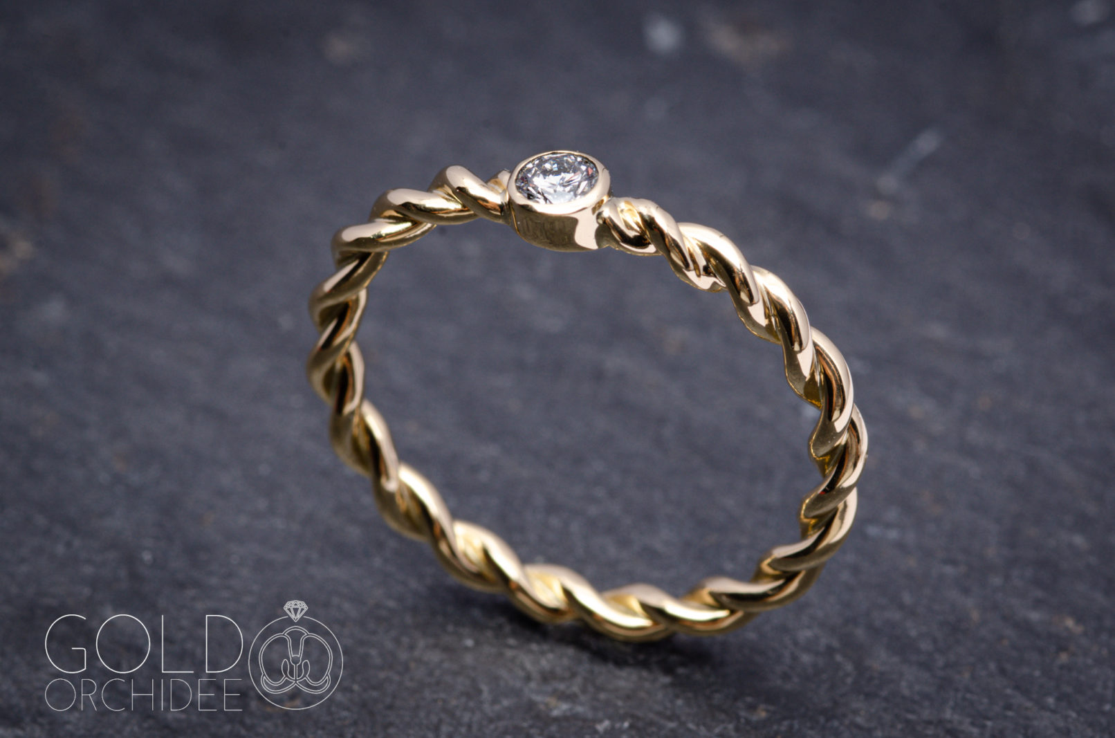 Die Kordel, die hier aus zwei >zusammengedrehten< Gelbgoldsträngen besteht, bildet eine Einheit und symbolisiert die Verbundenheit zwischen zwei Personen. Als Besonderheit liegt zwischen den Kordelenden ein Brillant. Schlicht durch seine reine weiße Farbe, strahlend durch seine Brillanz und besonders durch das Feuer, das Farbspiel welches sich beim Drehen in viele verschiedene bunte Lichtpunkte offenbart. Zusammengefasst ein Verlobungsring.